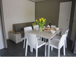Une pièce de vie avec un canapé-lit convertible (140x190), TV, une clim réversible, un coin repas avec une table (8 personnes) et 8 chaises, un coin cuisine avec un réfrigérateur, un congélateur, une plaque de cuisson, une hotte, une bouilloire, un micro-onde, une cafetière (à filtres), un évier avec eau chaude, la vaisselle et les ustensiles de cuisine, des placards pour ranger les denrées alimentaires, de grandes baies vitrées coulissantes séparant la cuisine de la terrasse.